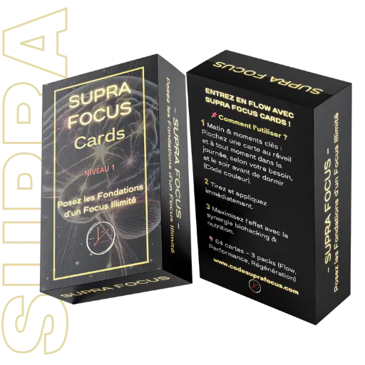 Boostez votre concentration, votre clarté mentale et votre puissance en 30 secondes. Conçues avec les neurosciences et le biohacking, les Supra Focus Cards sont votre kit d’activation cérébrale express. Entrepreneurs, artistes, sportifs ou étudiants : entrez dans un état de Flow, sur commande.